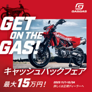 GASGAS キャッシュバックキャンペーンのご案内 2025.11.13 キャッシュバックキャンペーンのご案内 下記新車をご購入いただきますと、以下金額をキャッシュバック(税込)致します。 期間:11/1から12/24まで ■2022年モデル SM700 150,000円 ES700 150,000円